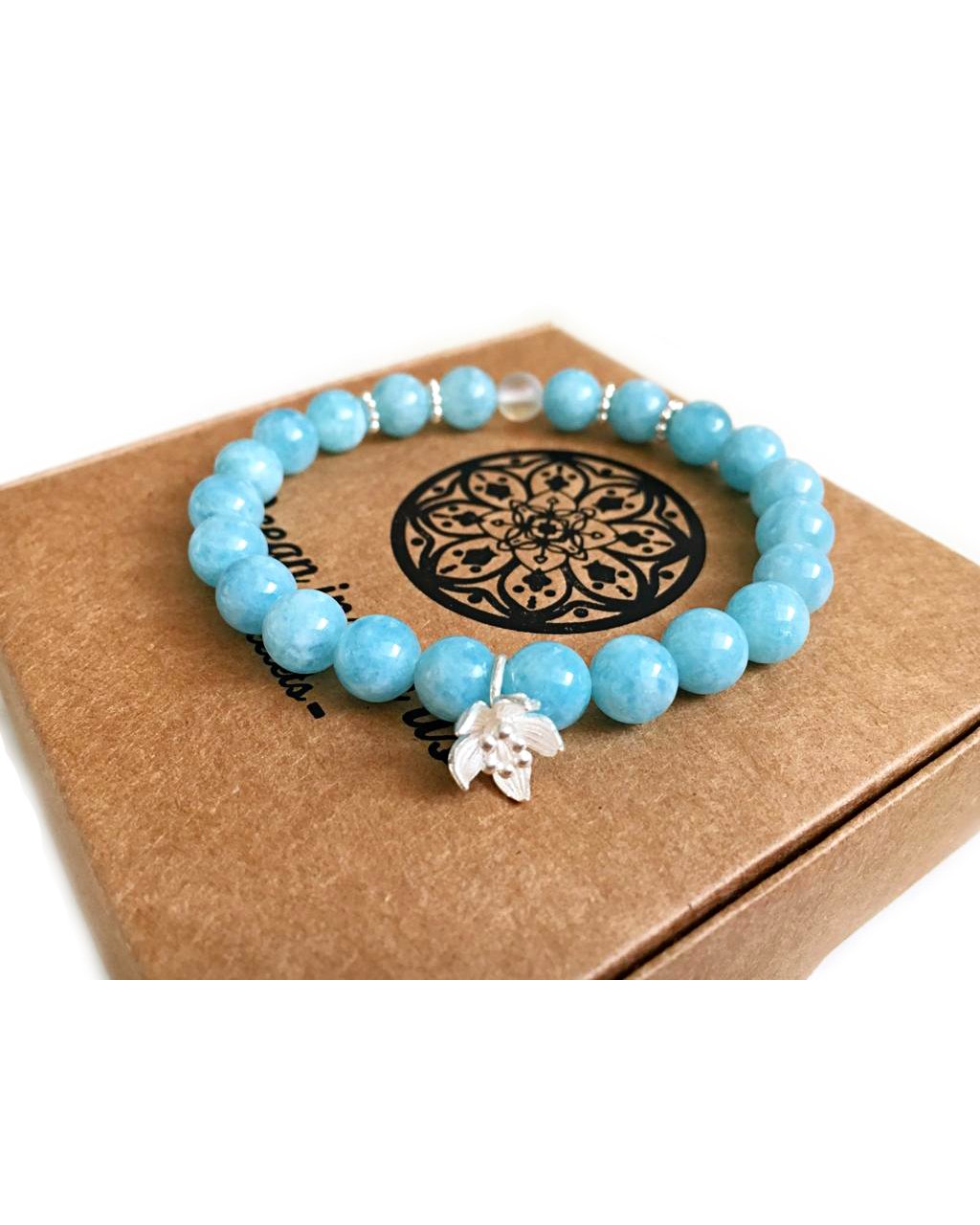 - náramek je vyroben z minerálních kamenů : krásný akvamarín a syntetický měsíční kámen