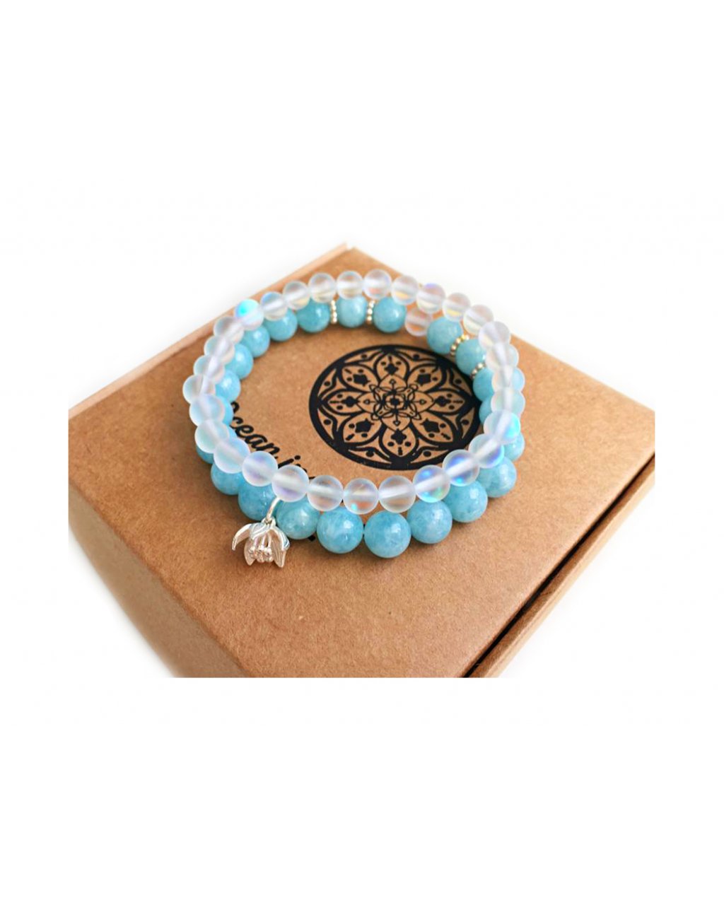 Krásný dvojitý náramek z jemného akvamarínu doplněný o luxusní přívěšek jemný květ a syntetický měsíční kámen.