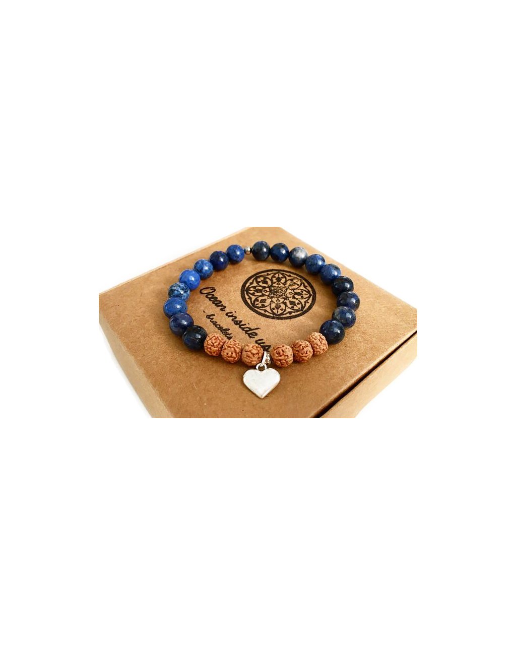 Tento krásně modrý náramek se srdíčkem je doplněn o semínka z posvátné rudrakshi.