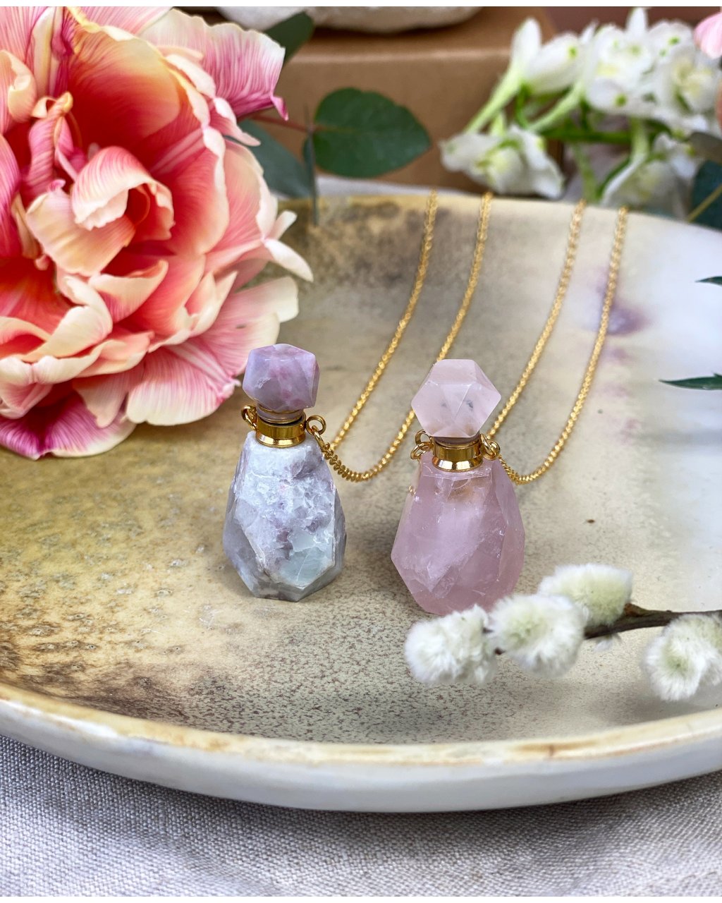 Jemný náhrdelník s lahvičkou na olejíček z broušeného růženínu.