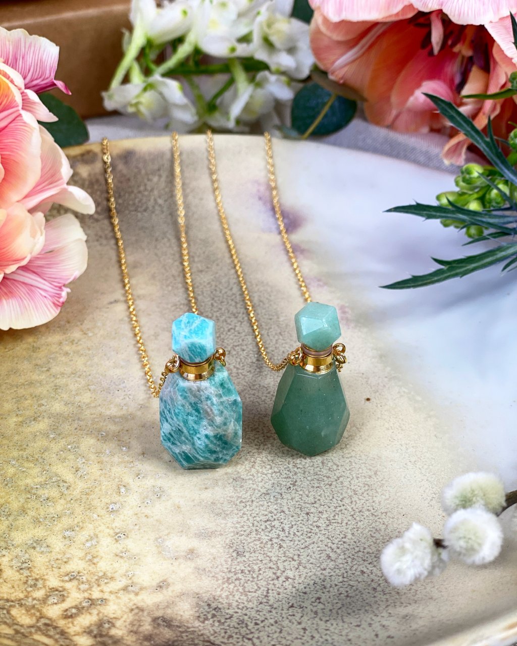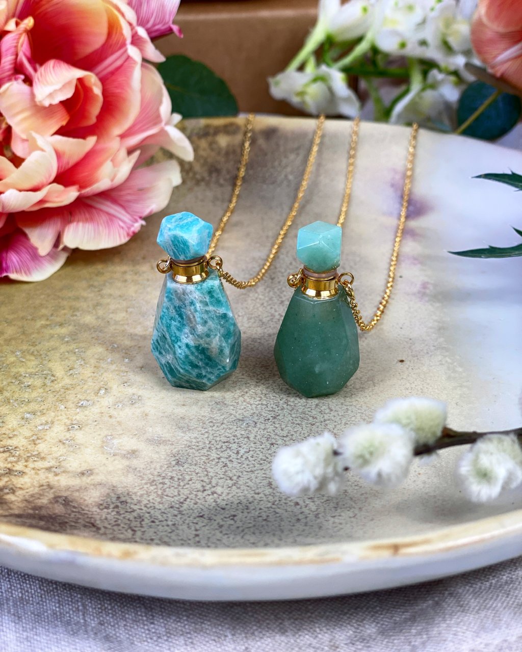 Jemný náhrdelník s lahvičkou na olejíček z broušeného zeleného aventurínu.